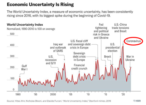 Quanto maior o valor do índice, maior é a percepção de incerteza no ambiente global, refletindo eventos como crises financeiras, mudanças políticas, guerras ou pandemias e, portanto, maior a tendência de cautela por parte de empresas e investidores.