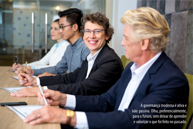 A governança moderna é ativa e não passiva. Olha, preferencialmente, para o futuro sem deixar de aprender e valorizar o que foi feito no passado, e busca sempre desafiar o modelo atual de negócios. E, por isto, não basta ter um conselho se ele não estiver alinhado com temas fundamentais: