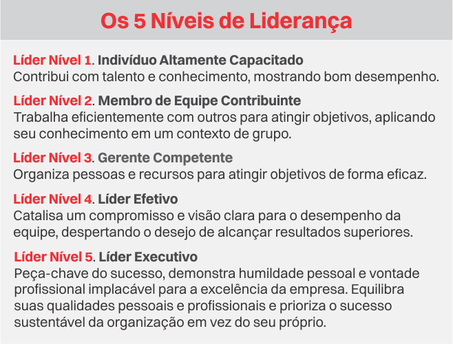 O pesquisador, escritor, palestrante e consultor norte-americano Jim Collins4 apresenta em seu livro best-seller “Feitas para Vencer” (Good to Great) o resultado de sua abrangente pesquisa sobre as razões por que as empresas têm sucesso, alcançam excelência e resultados superiores. O resultado? Liderança! Ele descreve os 5 Níveis de Liderança encontrados na comparação das empresas medianas e das vencedoras destacando a humildade como o Fator X da Liderança. Para Collins, a Liderança Nível 5 é caracterizada por uma combinação de humildade pessoal e uma vontade feroz para algo maior do que si mesmo. Os Líderes Nível 5 canalizam a sua energia e ambição para a causa, a empresa ou a cultura, priorizando o serviço e o sucesso da organização acima de seu ego pessoal. Vale muito a pena a leitura deste livro.