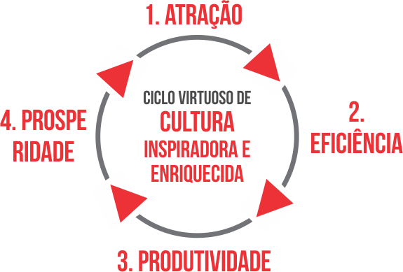 A soma da eficiência das pessoas e operações impacta na produtividade, na realização de mais resultados com menos recursos, de ganhos extras e superiores à média da indústria, do mercado. Imagine a quantidade de ideias de melhoria de uma equipe apaixonada pelo trabalho, o entusiasmo, a dedicação, o atendimento e encantamento dos clientes, como o Noah. E a produtividade geral cria a prosperidade, o resultado financeiro e social que retorna para todos os envolvidos na organização e enriquece todo o sistema. É um Ciclo Virtuoso de Cultura Inspiradora e Enriquecida.
