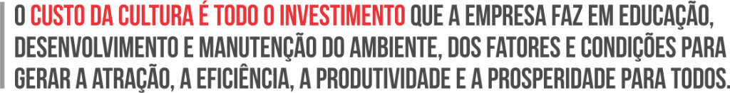 O custo da Cultura é todo o investimento que a empresa faz em educação, desenvolvimento e manutenção do ambiente, dos fatores e condições para gerar a atração, a eficiência, a produtividade e a prosperidade para todos. Como o Simon Sinek disse, os líderes e os gestores são os responsáveis pelo sucesso ou o fracasso da Cultura, e da empresa. Educação, educação, educação, em todo tempo, evento, oportunidade. Reconhecer, reforçar e promover os elementos da Cultura sempre (valores, visão, missão, princípios etc.), todos os dias, em todo tempo e lugar. Viver com coerência e congruência, alinhamento e direcionamento para todos. Gerar confiança, pertencimento, engajamento para ser e fazer o melhor. As pessoas amam se dedicar e trabalhar em um projeto inovador, valioso, vitorioso, vencedor. E odeiam os projetos duvidosos, tóxicos, mentirosos, de aparência boa, mas de miolo ruim.