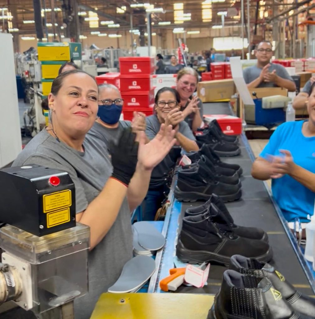 Mais impressionante ainda foi a naturalidade com que os líderes comentaram aquela cena: “Isso aqui é o normal, nosso dia a dia. Nada foi preparado. Podem conversar com quem quiser, perguntar sobre qualquer coisa.” Era como se houvesse ali um pacto de confiança, transparência e espírito de equipe. Os quadros espalhados pelas áreas mostravam os desafios diários de pares de calçados a serem entregues, ou seja, felicidade associada a produtividade.